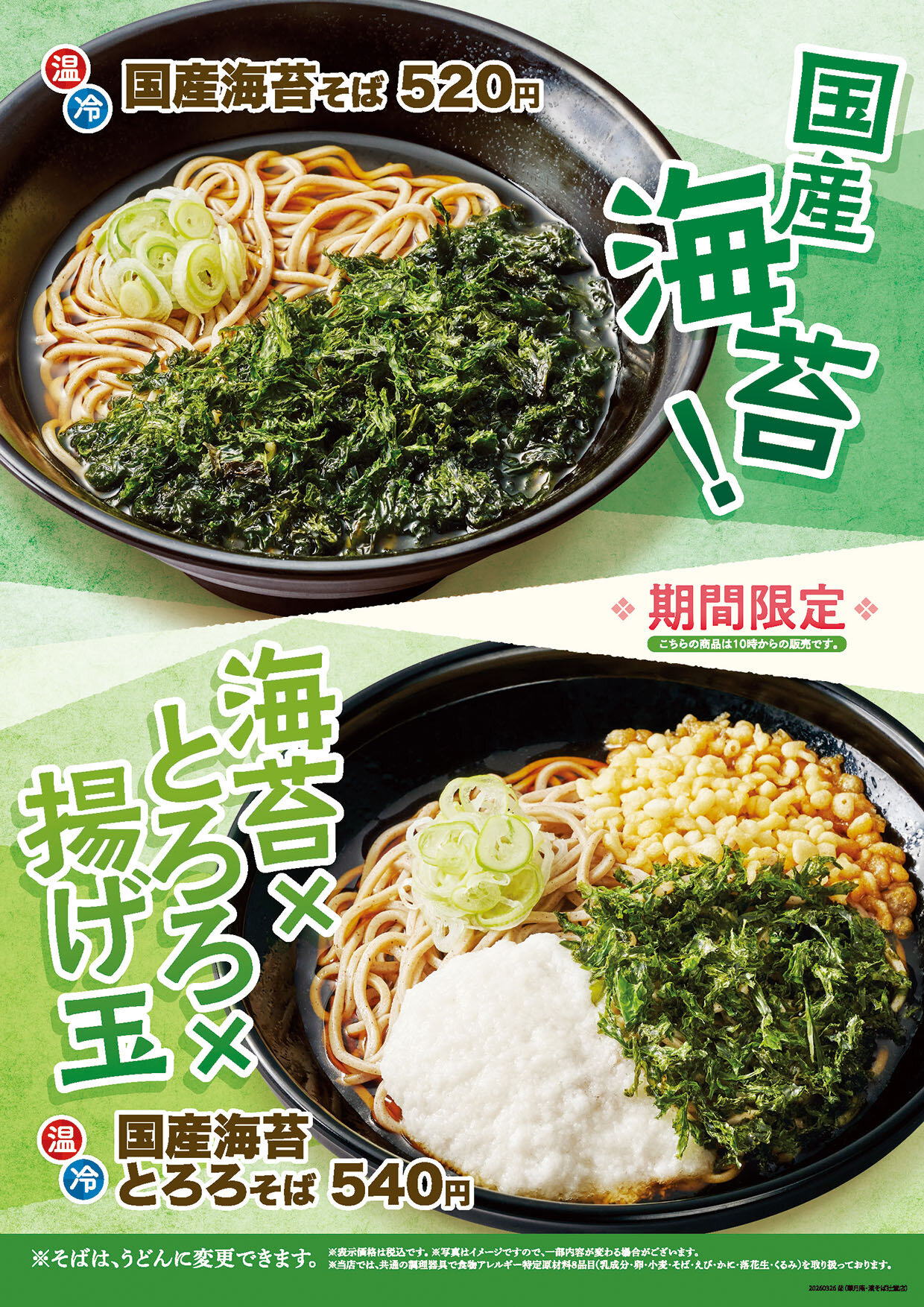 「国産海苔そば」520円「国産海苔とろろそば」540円