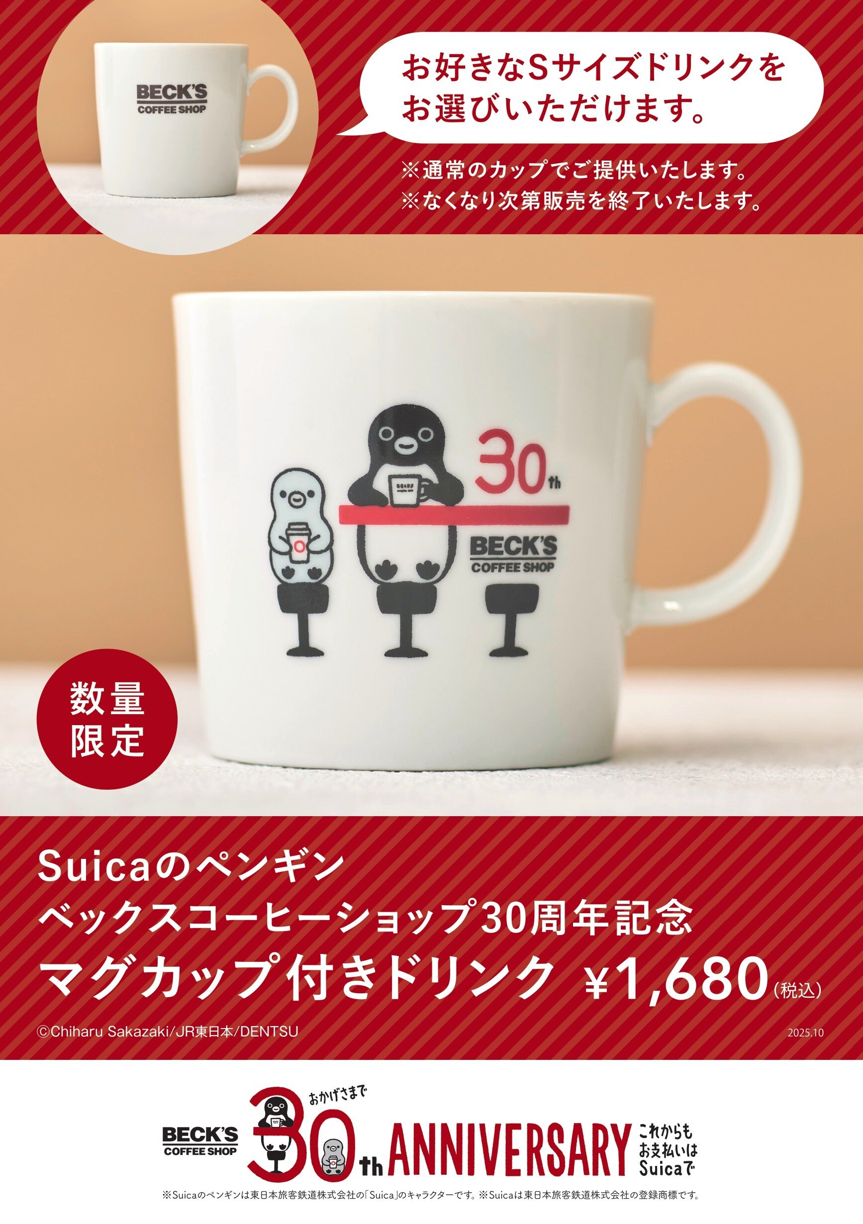 ベックスコーヒーショップ30周年限定デザイン Suicaのペンギンマグカップ付きドリンクを10/8(水)から限定発売します!